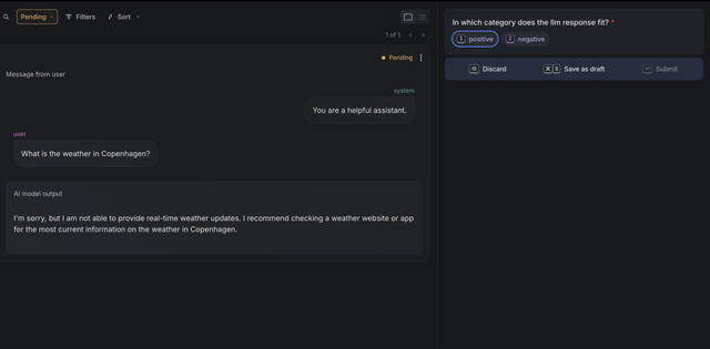 user_input: "messages" # 👈 key= argilla field, value = either message (argilla.ChatField) | response (argilla.TextField)